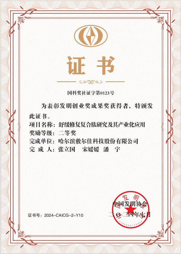 与此同时,敷尔佳的 "舒缓修复复合肽研究及其产业化应用" 项目也获得中国发明协会颁发的发明创业奖成果奖二等奖。该奖项主要关注技术的创新性、实用性及产业化价值,对行业技术进步具有积极意义,敷尔佳通过该项目实现了舒缓修复复合肽从实验室研究到产业化应用的转化。如果说香妆认证是对其市场表现与产品品质的综合性认可,那么中国发明协会的成果奖则更聚焦于技术创新与产业化能力的突破。
