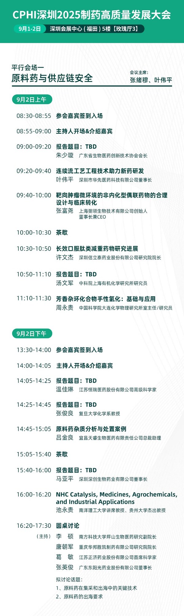 在此期间,深圳市坪山区小分子新药创联协会、南方科技大学坪山生物医药研究院携手CPHI主办方,举办"CPHI深圳2025制药高质量发展大会",会议以"湾区聚势破壁共生——构建全球生物医药韧性生态链"为主题,紧跟国家在医药、生物及AI+技术等多个领域重点的政策导向,以立足深圳、辐射大湾区、面向世界的优势,为国际医药全产业链提供高质量交流合作平台。欢迎报名,让我们共襄盛会!
