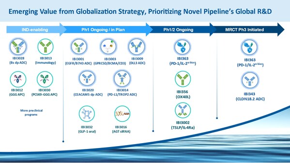 - 肿瘤:IBI3009(DLL3 ADC), IBI3001 (EGFR/B7H3 ADC),IBI3003(GPRC5D/BCMA/CD3), IBI3005(EGFR/HER3 ADC), IBI3014(PD-L1/TROP2 ADC) ,IBI3020(CEACAM5 dp ADC)等