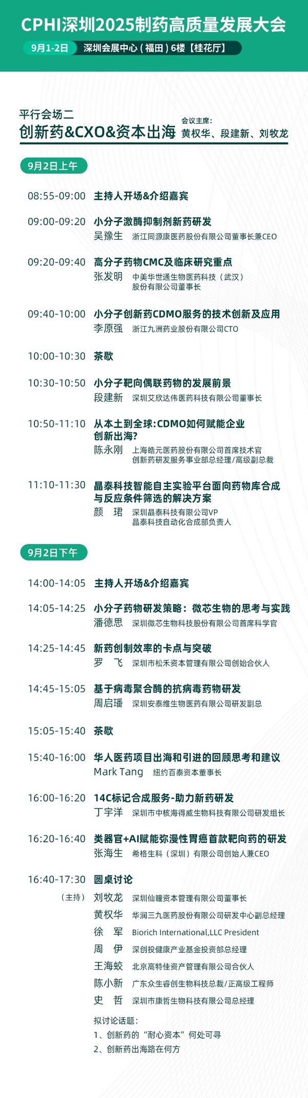 本次大会同期举办CPHI深圳2025,提供演讲赞助、圆桌论坛赞助、资料入袋、易拉宝等赞助合作机会,欢迎参会参展。