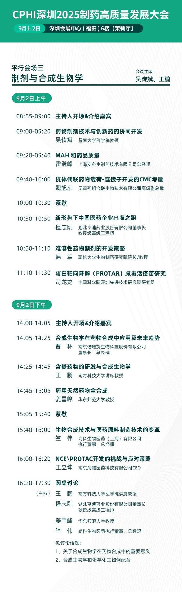 展会将辐射整个亚太市场及一带一路沿线地区,聚焦新药研发、智能制造及工艺创新,凝结产业前沿力量,展示创新成果与解决方案,携手共绘大湾区制药工业新蓝图。小分子新药创联协会、南方科技大学坪山生物医药研究院携手CPHI主办方,举办的第二届"CPHI深圳2025制药高质量发展大会"将同期召开。会议以"湾区聚势破壁共生——构建全球生物医药韧性生态链"为主题,紧跟国家在医药、生物及AI+技术等多个领域重点的政策导向,以立足深圳、辐射大湾区、面向世界的优势,为国际医药全产业链提供高质量交流合作平台。探寻产业新融合,优化产业链价值矩阵欢迎报名,让我们共襄盛会!