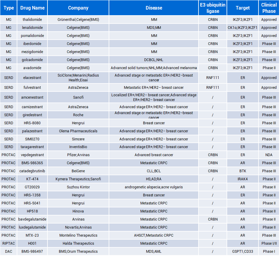 分子胶、SERD、PROTAC、RIPTAC和DAC分别有管线在临床阶段。其中分子胶和SERD都已经有药物上市,PROTAC进展最快的在NDA阶段。成熟的管线用到的E3连接酶大多数是CRBN,而在临床早期和临床前管线中,基于VHL疗法的新兴降解剂也占据着重要的地位。