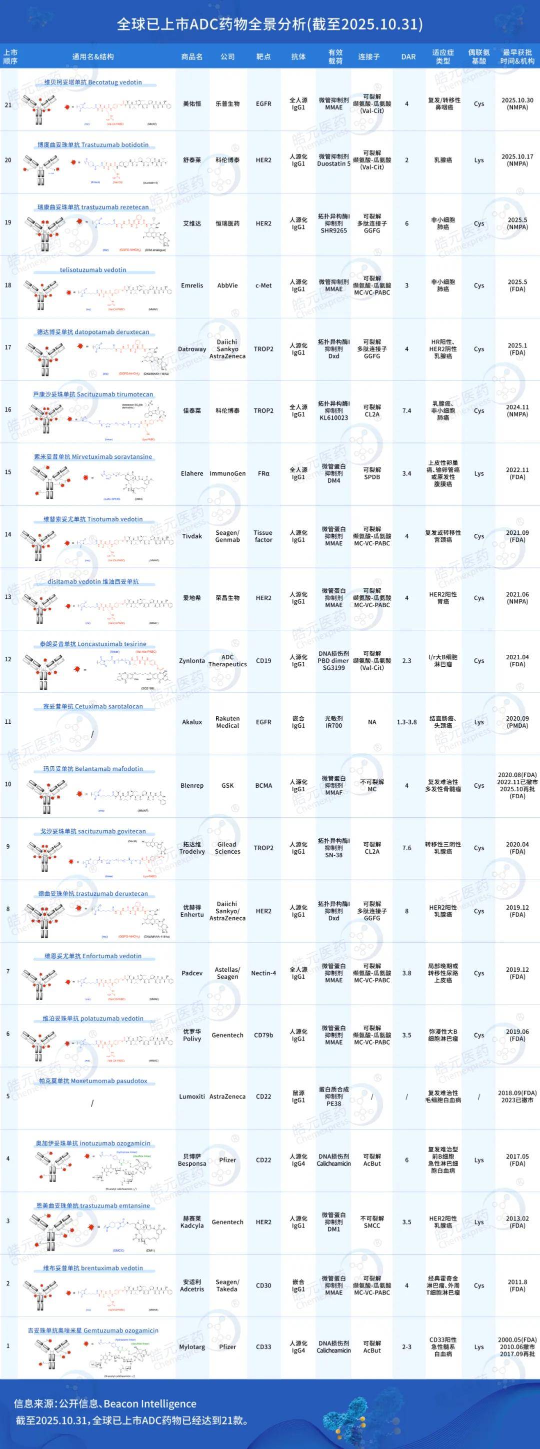截至 2025 .10.31,全球已上市ADC药物已经达到21款,覆盖乳腺癌、淋巴瘤、胃癌、肺癌、尿路上皮癌等 10 余种恶性肿瘤,为无数晚期癌症患者带来了 “延长生存期、提升生活质量” 的新希望。