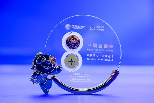 本次进博会期间,中国国际进口博览局党委书记、副局长,国家会展中心董事长吴政平一行莅临拜耳展台,向连续第八年参展的拜耳中国颁发"8年全勤"奖牌,以表彰其多年来在健康和营养领域为进博会作出的积极贡献。拜耳中国公共与政府事务及可持续发展副总裁王甦女士代表拜耳接受荣誉。这一奖项体现了进博局对拜耳长期支持进博会、持续推动开放合作的高度认可。