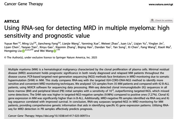 北京2025年11月10日 /美通社/ -- 近日,陆道培分子医学团队与哈尔滨医科大学第二医院(哈医大二院)合作的研究成果,发表于Nature出版集团旗下学术期刊 Cancer Gene Therapy(IF=5.0)。论文题为:Using RNA-seq for detecting MRD in multiple myeloma: high sensitivity and prognostic value。本研究首次建立了一套基于全转录组测序(RNA-seq)的高灵敏度、高准确性的多发性骨髓瘤(MM)微小残留病(MRD)监测新流程,并系统验证了其在MM-MRD临床监测中的准确性与临床价值,为MM治疗监测提供了一种更灵敏、更准确的新策略。