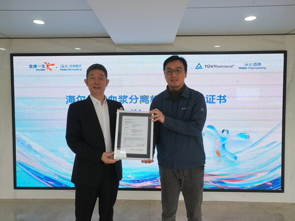 重庆2026年1月16日 /美通社/ -- 1月16日,国际独立第三方检测、检验和认证机构德国莱茵TÜV大中华区(简称"TÜV莱茵")为海尔生物医疗旗下子公司海尔血液技术重庆有限公司(简称"海尔血技")血浆分离设备颁发了基于欧盟医疗器械法规(Regulation (EU) 2017/745,简称MDR)的公告机构证书。这表明该产品已满足欧盟市场相关准入要求,为其拓展欧洲及全球市场奠定重要基础。海尔生物医疗总经理刘占杰、海尔血技总经理刘吉元、副总经理于浩、鲁安松,TÜV莱茵大中华区医疗器械服务华东区域经理陈煜星等双方代表出席了颁证仪式。