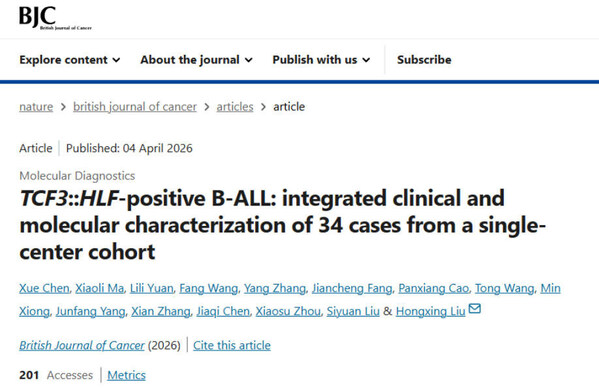 北京2026年4月27日 /美通社/ -- 2026年4月4日,陆道培医院分子医学团队在国际权威肿瘤学期刊《英国癌症杂志》(British Journal of Cancer)在线发表了最新研究成果。该研究题为《TCF3::HLF阳性B-ALL:单中心34例患者的综合临床与分子特征》,这是迄今为止全球针对此类极罕见、极高危白血病规模最大、最全面的单中心临床和全转录组测序(WTS)分析报道。