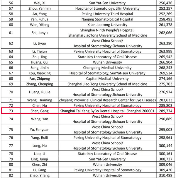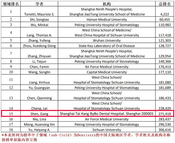(*本表所列为榜单中子领域(sub-field)为Dentistry的部分中国大大陆地区学者,学者姓名及机构名称榜榜单原版内容呈现)