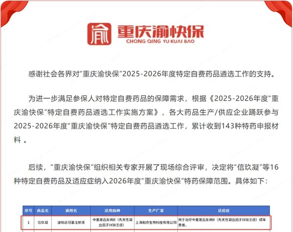 上海2025年9月28日 /美通社/ -- 2025年9月25日,我国首个获批的[1]血友病B基因治疗药物信玖凝®(波哌达可基注射液)被正式纳入2026年度"重庆渝快保"特药保障范围[2]。这一举措不仅是重庆鼓励落实创新药患者可及的重要实践,更标志着罕见病基因治疗药物通过"研发+商业化+保障"协同模式,形成与基本医疗保险相衔接和补充的多层次医疗保障体系,将大幅降低患者自费负担,为重庆血友病 B 患者带来治疗新希望。作为重庆市医疗保障局与国家金融监督管理总局重庆监管局联合指导的普惠型商业补充保险,"重庆渝快保"以"不限年龄、不限健康状况"的包容属性[3],构建起创新药支付响应的"重庆速度",让基因治疗这一划时代临床价值的创新成果,更快惠及重庆患者。