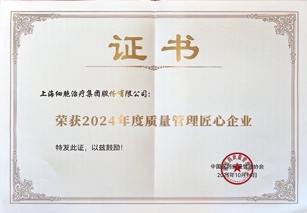 上海2025年10月28日 /美通社/ -- 10月15日-17日中国医药质量管理协会年度盛事2025学术年会暨药品质量发展大会在吉林通化举行,大会邀请药检所、高校和医药研发生产企业,对药品监管、药典法规、医药发展概况等进行解读。期间,大会发布了"2024年度质量管理匠心企业"评审结果,并由中国医药质量管理协会会长、中国工程院院士肖伟院士进行颁奖。上海细胞治疗集团股份有限公司凭借在"存以药用"高质量细胞原材料以及细胞药物全链条质量管控、质量文化建设与创新实践等方面的卓越表现,荣获"质量管理匠心企业"称号。上海细胞治疗集团联合创始人、首席运营官兼新药创制BG董事长孙艳女士作为集团代表出席颁奖典礼并上台领奖。