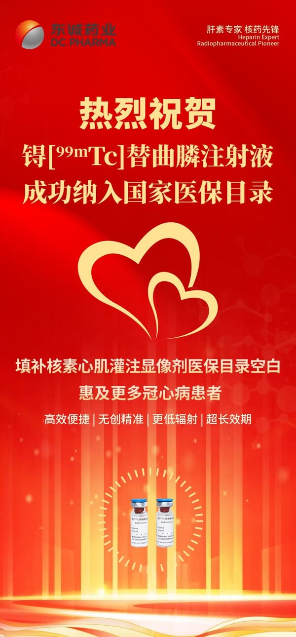 南京江原安迪科(东诚药业全资子公司)生产的锝[99m Tc]替曲膦注射液先后经过资料申报、形式审查、专家评审、现场谈判等环节,成功纳入国家医保目录,未来将极大程度减轻患者经济负担,提高患者对SPECT-MPI检查的可及性,促进冠状动脉疾病诊疗精准化。